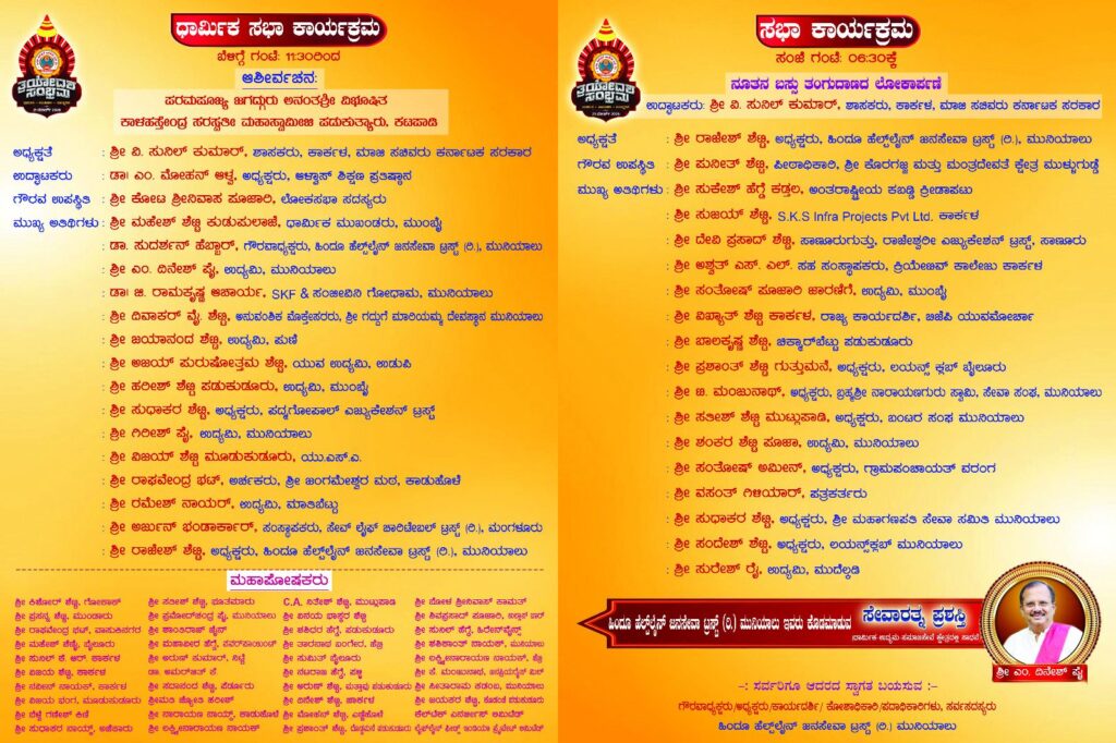ಸಮಾರಂಭದಲ್ಲಿ ಎಂ ದಿನೇಶ್ ಪೈ ಇವರಿಗೆ ಹಿಂದೂ ಹೆಲ್ಪ್ ಲೈನ್ ಜನ ಸೇವಾ ಟ್ರಸ್ಟ್ ರಿ. ಮುನಿಯಾಲು, ಕೊಡ ಮಾಡುವ “ಸೇವಾರತ್ನ ಪ್ರಶಸ್ತಿ” ಸನ್ಮಾನ ನಡೆಯಲಿದೆ.