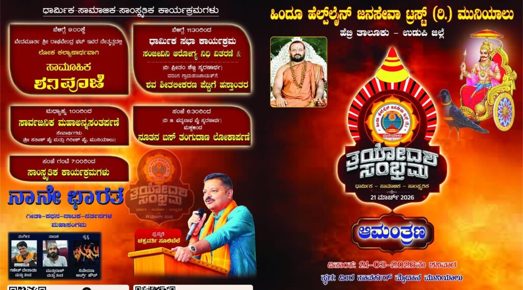 ಮುನಿಯಾಲು: ಮಾರ್ಚ್ 21 ರಂದು ಹಿಂದೂ ಹೆಲ್ಪ್ ಲೈನ್ ಜನ ಸೇವಾ ಟ್ರಸ್ಟ್ (ರಿ).ಮುನಿಯಾಲು ಇದರ ವತಿಯಿಂದ ಮುನಿಯಾಲಿನ ವೀರ ಸಾವರ್ಕರ್ ಮೈದಾನದಲ್ಲಿ, ಧಾರ್ಮಿಕ ಮತ್ತು ಸಾಮಾಜಿಕ ,ಸಾಂಸ್ಕೃತಿಕ ಸಮನ್ವಯದೊಂದಿಗೆ “ತ್ರಯೋದಶ ಸಂಭ್ರಮ’ ಎಂಬ ವಿಶೇಷ ಕಾರ್ಯಕ್ರಮವನ್ನು ಆಯೋಜಿಸಲಾಗುತ್ತಿದೆ.
