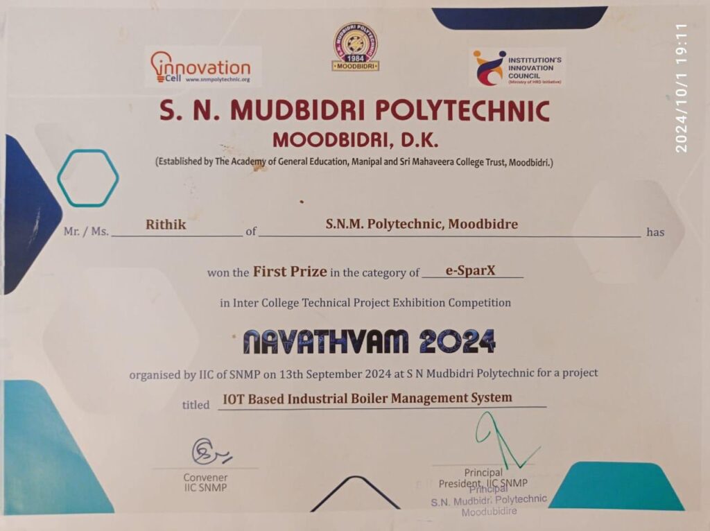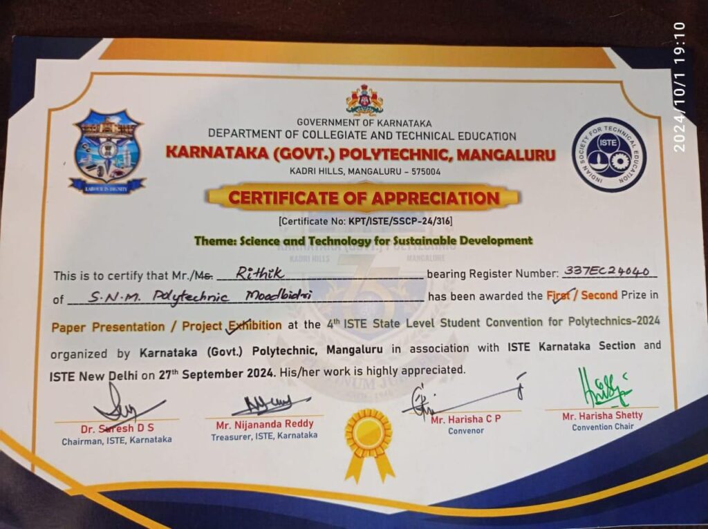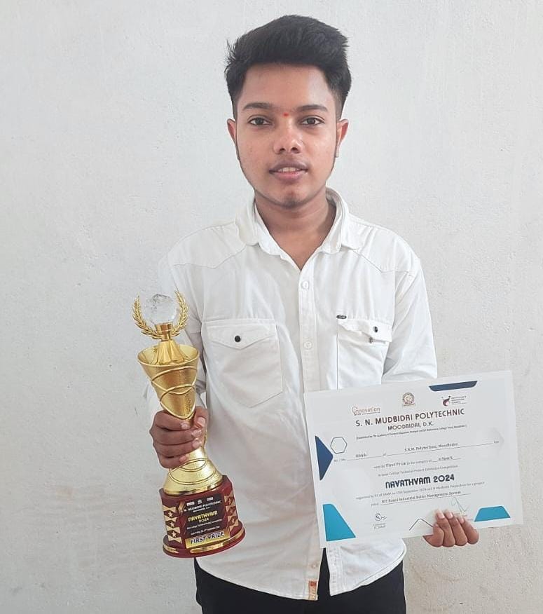 ನಂತರ ಮಂಗಳೂರಿನ ಕರ್ನಾಟಕ ಪಾಲಿಟೆಕ್ನಿಕ್ ಮಂಗಳೂರು (KPT) ಕಾಲೇಜಿನಲ್ಲಿ ಕರ್ನಾಟಕ ಸರ್ಕಾರದ ಯೋಜನೆಯಡಿಯಲ್ಲಿ ಸೆಪ್ಟೆಂಬರ್ 27ರಂದು ಆಯೋಜಿಸಿದ್ದ ರಾಜ್ಯ ಮಟ್ಟದ ಕೈಗಾರಿಕೆ ಮತ್ತು ತಾಂತ್ರಿಕ ವಿಭಾಗದ ಸ್ಪರ್ಧಾತ್ಮಕ ಕಾರ್ಯಕ್ರಮದಲ್ಲಿ ಭಾಗವಹಿಸಿ ಪ್ರಥಮ ಬಹುಮಾನ ಪಡೆದು ರಾಷ್ಟ್ರ ಮಟ್ಟಕ್ಕೆ ಆಯ್ಕೆಯಾಗಿದ್ದಾರೆ.