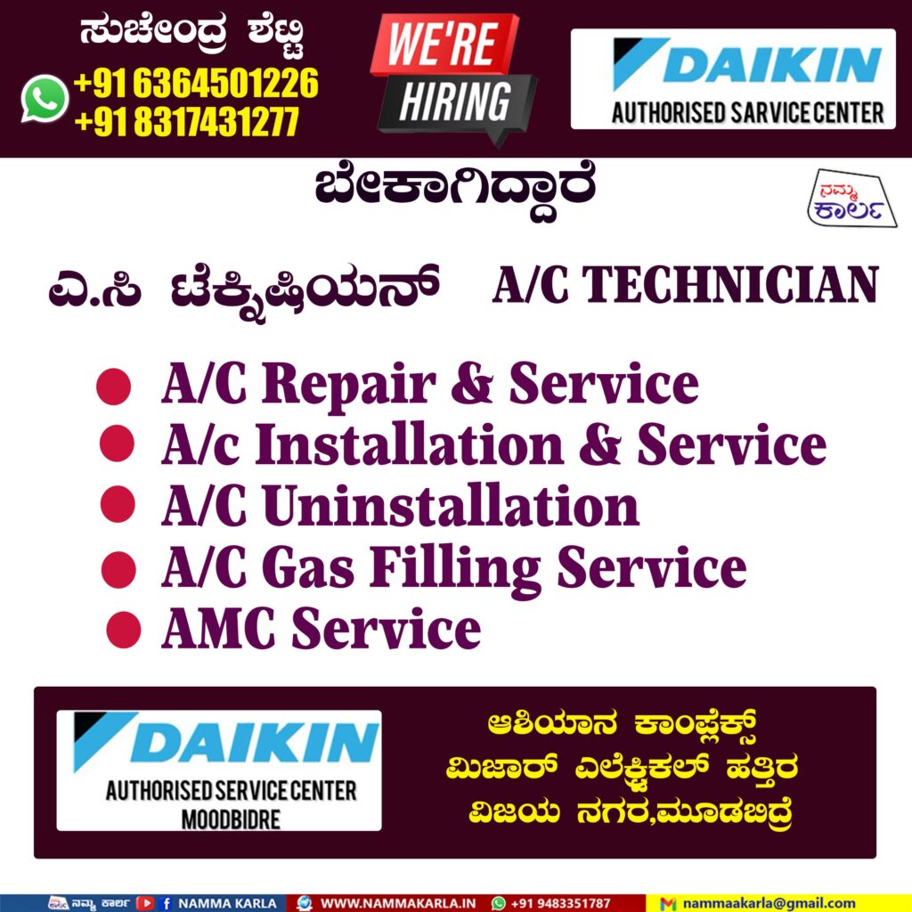 ಮೂಡುಬಿದಿರೆ: DAIKIN Authorised Service Centre ನಲ್ಲಿ ಎಸಿ ಟೆಕ್ನಿಷಿಯನ್ ಕೆಲಸಕ್ಕೆ ಜನ ಬೇಕಾಗಿದ್ದಾರೆ.