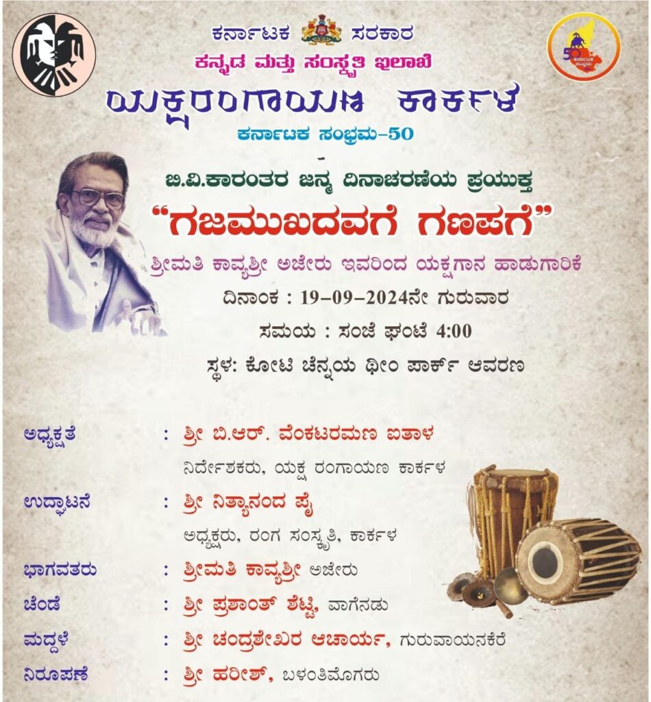 ಆಧುನಿಕ ಭಾರತೀಯ ರಂಗಭೂಮಿಗೆ ಹೊಸ ಜೀವಚೈತನ್ಯ ನೀಡಿದ ಮಹಾನ್ ಪ್ರತಿಭೆ ದಿವಂಗತ ಶ್ರೀ ಬಿ.ವಿ. ಕಾರಂತ ಅವರ ಜನ್ಮದಿನದಂದು ಯಕ್ಷರಂಗಾಯಣ, ಕಾರ್ಕಳ ವತಿಯಿಂದ ದಿನಾಂಕ 19, ಸೆಪ್ಟೆಂಬರ್ 2024 ಗುರುವಾರ ಸಂಜೆ 4.00 ಗಂಟೆಗೆ ”ಗಜಮುಖದವಗೆ ಗಣಪಗೆ ” ಎಂಬ ಕಾರ್ಯಕ್ರಮವನ್ನು ಆಯೋಜಿಸಲಾಗಿದೆ.