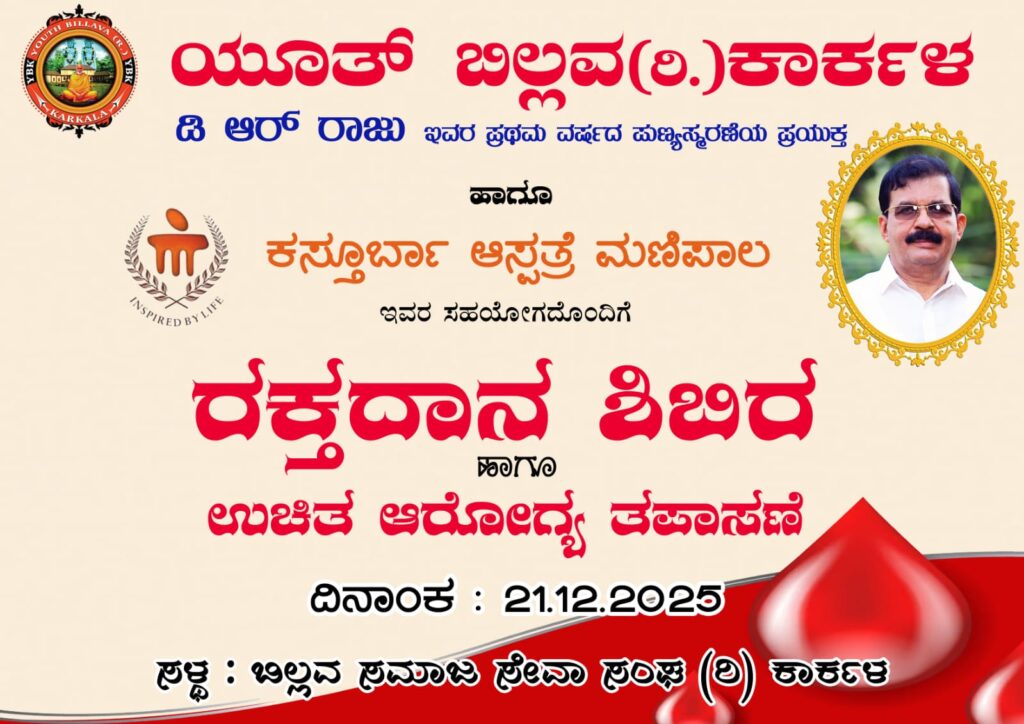 ಯೂತ್ ಬಿಲ್ಲವ (ರಿ.)ಕಾರ್ಕಳ ಡಿ ಆರ್ ರಾಜು ಇವರ ಪ್ರಥಮ ವರ್ಷದ ಪುಣ್ಯಸ್ಮರಣೆಯ ಪ್ರಯುಕ್ತ ಹಾಗೂ ಕಸ್ತೂರ್ಬಾ ಆಸ್ಪತ್ರೆ ಮಣಿಪಾಲ ಇವರ ಸಹಯೋಗದೊಂದಿಗೆ ರಕ್ತದಾನ ಶಿಬಿರ ಹಾಗೂ ಉಚಿತ ಆರೋಗ್ಯ ತಪಾಸಣೆಯು ದಿನಾಂಕ 21-12-2025 ನೇ ಆದಿತ್ಯವಾರ ಗಂಟೆ 9 ಕ್ಕೆ ಸರಿಯಾಗಿ ಬಿಲ್ಲವ ಸಮಾಜ ಸೇವಾ ಸಂಘ (ರಿ )ಕಾರ್ಕಳ ಇಲ್ಲಿ ನಡೆಯಲಿದೆ