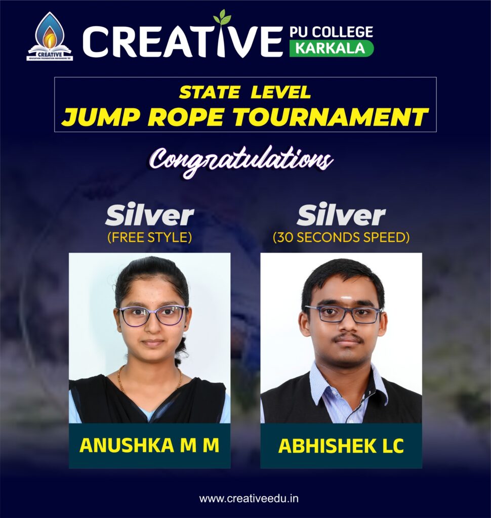 ಕಾರ್ಕಳದ ಕ್ರಿಯೇಟಿವ್ ಕಾಲೇಜಿನ ವಿದ್ಯಾರ್ಥಿನಿ ಅನುಷ್ಕಾ ಮಹಾಂತೇಶ ಮುರಗೋಡ ರವರು ಜಂಪ್ ರೋಪಿಂಗ್ ಫ್ರೀ ಸ್ಟೈಲ್ ವಿಭಾಗದಲ್ಲಿ ದ್ವಿತೀಯ ಸ್ಥಾನಗಳಿಸಿ ಬೆಳ್ಳಿ ಪದಕ ಹಾಗೂ ಹುಡುಗರ ವಿಭಾಗದಲ್ಲಿ 30 ಸೆಕೆಂಡುಗಳ ಅವಧಿಯ ಜಂಪ್ ರೋಪಿಂಗ್  ನಲ್ಲಿ ಅಭಿಷೇಕ್ ಎಲ್. ಸಿ ರವರು ದ್ವಿತೀಯ ಸ್ಥಾನದೊಂದಿಗೆ ರಜತ ಪದಕವನ್ನು ಪಡೆದುಕೊಂಡಿರುತ್ತಾರೆ.