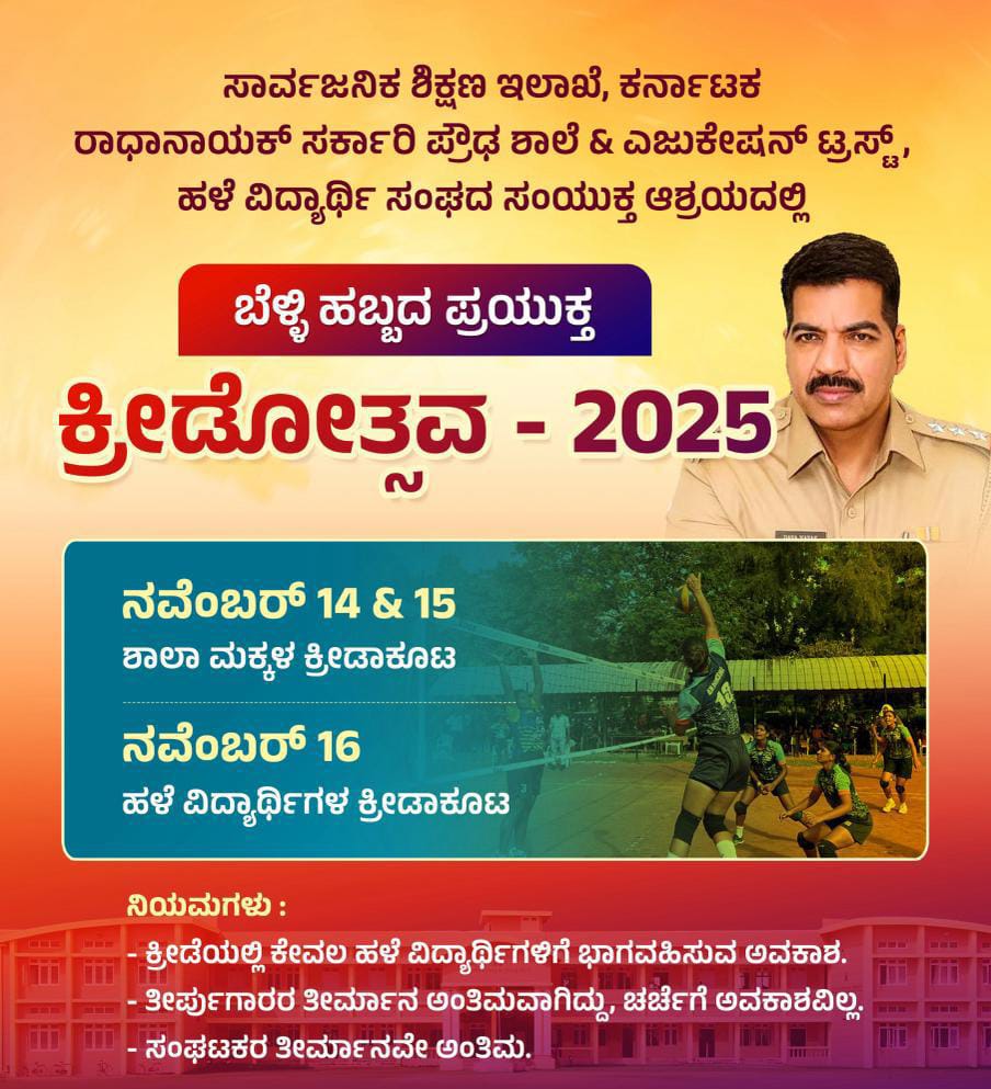 ಕಾರ್ಕಳ: ಸಾರ್ವಜನಿಕ ಶಿಕ್ಷಣ ಇಲಾಖೆ, ಕರ್ನಾಟಕ ರಾಧಾನಾಯಕ್ ಸರ್ಕಾರಿ ಪ್ರೌಢ ಶಾಲೆ, ಎಜುಕೇಷನ್ ಟ್ರಸ್ಟ್ ಹಾಗೂ ಹಳೆ ವಿದ್ಯಾರ್ಥಿ ಸಂಘದ ಸಂಯುಕ್ತ ಆಶ್ರಯದಲ್ಲಿ “ಕ್ರೀಡೋತ್ಸವ – 2025” ಕಾರ್ಯಕ್ರಮವನ್ನು ಆಯೋಜಿಸಲಾಗಿದೆ.