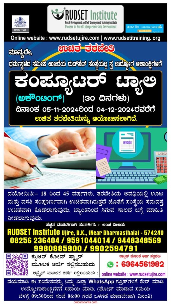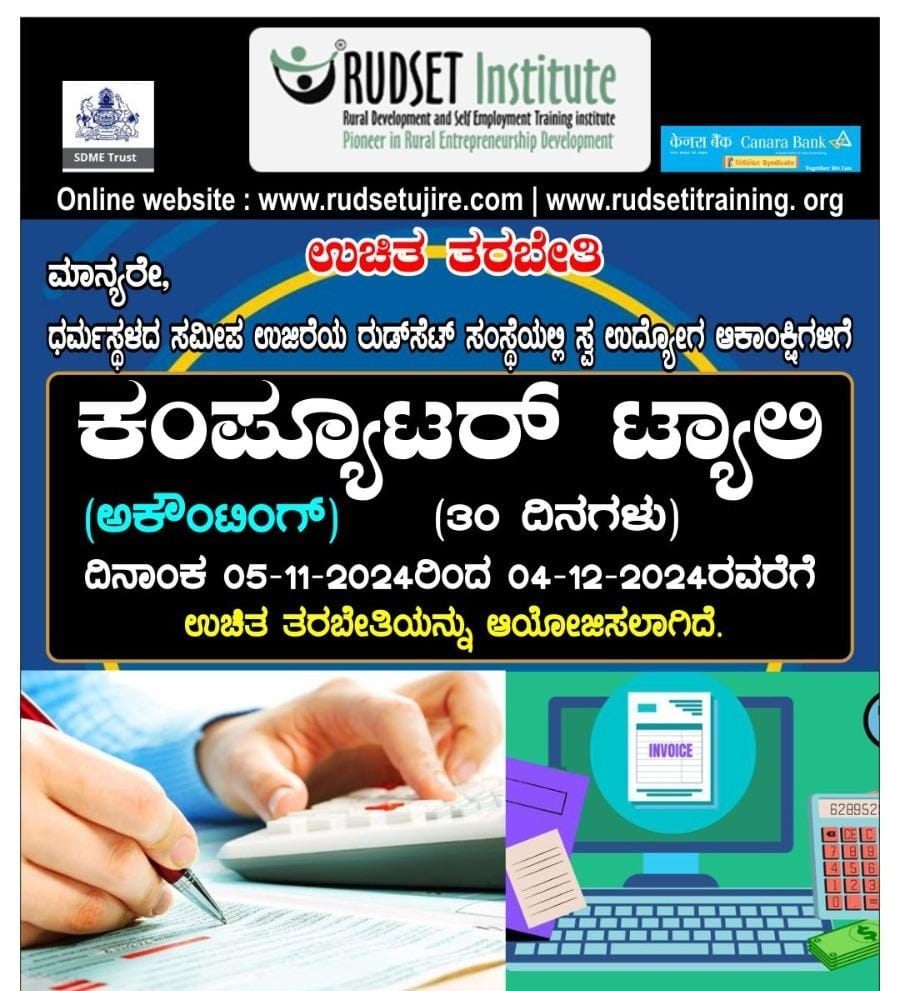 ರುಡ್ ಸೆಟ್ ಸಂಸ್ಥೆ, ಉಜಿರೆ, ದಕ್ಷಿಣ ಕನ್ನಡ ಜಿಲ್ಲೆ ಇಲ್ಲಿ ನಾವು ಕಂಪ್ಯೂಟರ್ ಟ್ಯಾಲಿ (Computer Tally) ತರಬೇತಿಯನ್ನು ಆಯೋಜಿಸಿದ್ದು