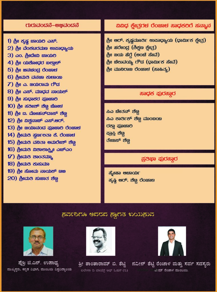 ಮುಂಬೈ ಸಾಧಕರುಗಳಾದ ಶೇಖರ್ ಶೆಟ್ಟಿ ಕಲ್ಲರಾಡಿ ಮುಂಬೈ, ಜಯ ಆರ್. ಶೆಟ್ಟಿ ರೆಂಜಾಳ ಪುಣೆ, ಗೋಪಾಲ್ ಹೆಗ್ಡೆ ಕಲ್ಯಾಣ್ ಮುಂಬೈ ಮತ್ತು ಯುವ ಉದ್ಯಮಿ ಅಮಿತ್ ಶೆಟ್ಟಿ ರೆಂಜಾಳ ಸಿಲ್ವಸ ಅವರನ್ನು ಸಮ್ಮಾನಿಸಲಾಗುವುದು