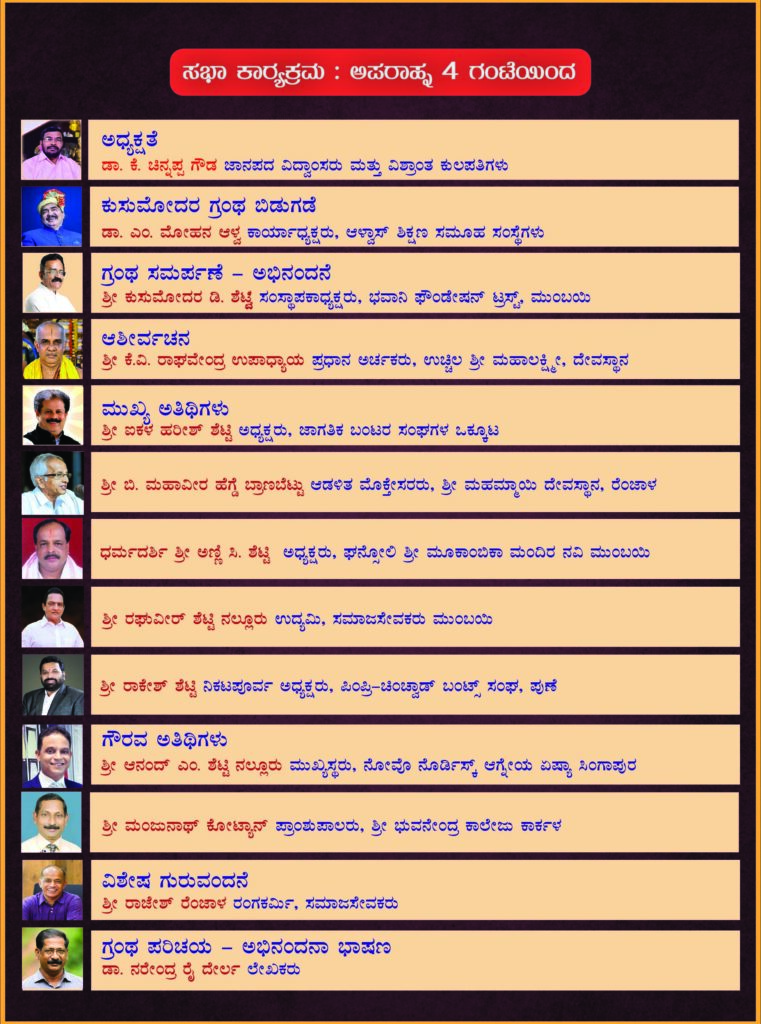 ಲೇಖಕ ಡಾ. ನರೇಂದ್ರ ರೈ ದೇರ್ಲ ಗ್ರಂಥ ಪರಿಚಯ ಮತ್ತು ಅಭಿನಂದನಾ ಭಾಷಣ ಮಾಡಲಿದ್ದಾರೆ. ಮುಖ್ಯ ಅತಿಥಿಗಳಾಗಿ ಜಾಗತಿಕ ಬಂಟರ ಸಂಘಗಳ ಒಕ್ಕೂಟದ ಅಧ್ಯಕ್ಷ ಐಕಳ ಹರೀಶ್‌ ಶೆಟ್ಟಿ, ರೆಂಜಾಳ ಶ್ರೀ ಮಹಾಮ್ಮಾಯಿ ದೇವಸ್ಥಾನದ ಆಡಳಿತ ಮೊಕ್ತಸರ ಬಿ. ಮಹಾವೀರ ಹೆಗ್ಡೆ ಬ್ರಾಣಬೆಟ್ಟು, ನವಿಮುಂಬಯಿ ಘನ್ನೋಲಿ ಶ್ರೀ ಮೂಕಾಂಬಿಕಾ ಮಂದಿರದ ಅಧ್ಯಕ್ಷ ಅಣ್ಣಿಸಿ. ಶೆಟ್ಟಿ, ಉದ್ಯಮಿ ರಘುವೀ‌ರ್ ಶೆಟ್ಟಿ ನಲ್ಲೂರು, ಪುಣೆ ಪಿಂಪ್ರಿ-ಚಿಂಕ್ವಾಡ್ ಬಂಟ್ಸ್ ಸಂಘದ ನಿಕಟಪೂರ್ವ ಅಧ್ಯಕ್ಷ ರಾಕೇಶ್ ಶೆಟ್ಟಿ ಬೆಳ್ಳಾರೆ, ನೋವೊ ನೊರ್ಡಿಸ್ಕ್ ಆಗ್ನೆಯ ಏಷ್ಯಾ ಸಿಂಗಾಪುರ ಇದರ ಮುಖ್ಯಸ್ಥ ಆನಂದ್‌ ಎಂ. ಶೆಟ್ಟಿ ನಲ್ಲೂರು, ಶ್ರೀ ಭುವನೇಂದ್ರ ಕಾಲೇಜು ಪ್ರಾಂಶುಪಾಲ ಮಂಜುನಾಥ ಕೋಟ್ಯಾನ್ ಸೇರಿದಂತೆ ಮೊದಲಾದವರು ಭಾಗಿಯಾಗಲಿದ್ದಾರೆ.