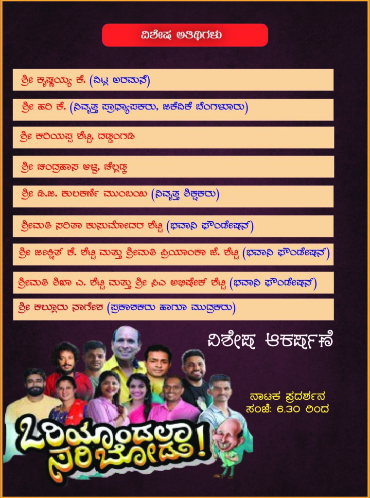 ಸಂಜೆ 4 ಗಂಟೆಗೆ ಸಭಾ ಕಾರ್ಯಕ್ರಮ ನಡೆಯಲಿದ್ದು, ವಿಶ್ರಾಂತ ಕುಲಪತಿ, ಜಾನಪದ ವಿದ್ವಾಂಸ ಡಾ. ಕೆ. ಚಿನ್ನಪ್ಪ ಗೌಡ ಅಧ್ಯಕ್ಷತೆ ವಹಿಸಲಿದ್ದಾರೆ. ಆಳ್ವಾಸ್‌ ಶಿಕ್ಷಣ ಪ್ರತಿಷ್ಠಾನದ ಅಧ್ಯಕ್ಷ ಡಾ. ಎಂ. ಮೋಹನ ಆಳ್ವ ಅವರು ಕುಸುಮೋದರ ಗ್ರಂಥ ಬಿಡುಗಡೆ ಮಾಡಲಿದ್ದಾರೆ. ಮುಂಬಯಿ ಭವಾನಿ ಫೌಂಡೇಶನ್ ಟ್ರಸ್ಟ್ ಸಂಸ್ಥಾಪಕಾಧ್ಯಕ್ಷ ಕುಸುಮೋದರ ಡಿ. ಶೆಟ್ಟಿ ಅವರಿಗೆ ಗ್ರಂಥ ಸಮರ್ಪಣೆ ಹಾಗೂ ಅಭಿನಂದನೆ ನಡೆಯಲಿದೆ. ಉಚ್ಚಿಲ ಶ್ರೀ ಮಹಾಲಕ್ಷ್ಮೀ ದೇವಸ್ಥಾನದ ಪ್ರಧಾನ ಅರ್ಚಕ ಕೆ. ವಿ. ರಾಘವೇಂದ್ರ ಉಪಾಧ್ಯಾಯ ಆಶೀರ್ವಚನ ನೀಡಲಿದ್ದಾರೆ. ರಂಗಕರ್ಮಿ ರಾಜೇಶ್ ರೆಂಜಾಳ ಅವರಿಗೆ ವಿಶೇಷ ಗುರುವಂದೆನೆ ನಡೆಯಲಿದೆ.