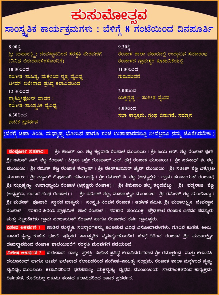 ರೆಂಜಾಳ:ನ.03 ರಂದು ಕುಸುಮೋತ್ಸವ-ಕುಸುಮೋದರ ಗ್ರಂಥ ಲೋಕಾರ್ಪಣೆ