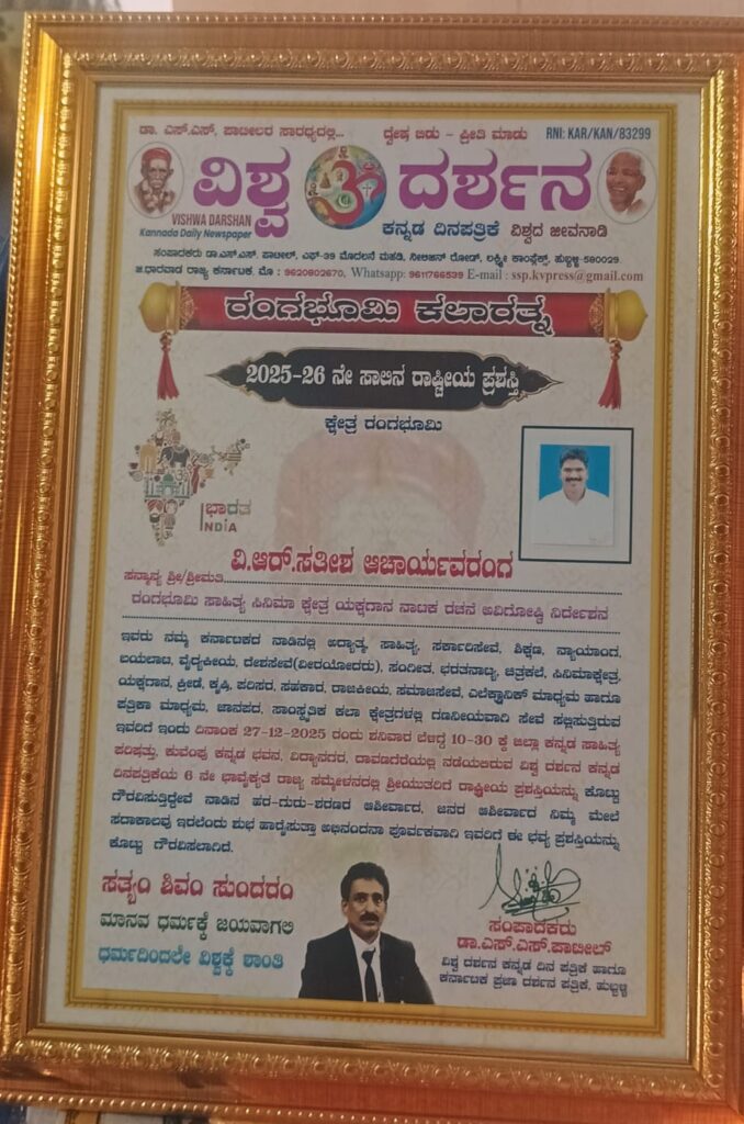 ವಿಶ್ವ ದರ್ಶನ ಸಾಹಿತ್ಯ ಸಮ್ಮೇಳನದಲ್ಲಿ ರಂಗಭೂಮಿ ಕಲಾವಿದ ವಿ ಆರ್ ಸತೀಶ್ ಆಚಾರ್ಯ ವರಂಗ ಇವರಿಗೆ “ರಂಗಭೂಮಿ ಕಲಾರತ್ನ ರಾಷ್ಟ್ರೀಯ ಪ್ರಶಸ್ತಿ”