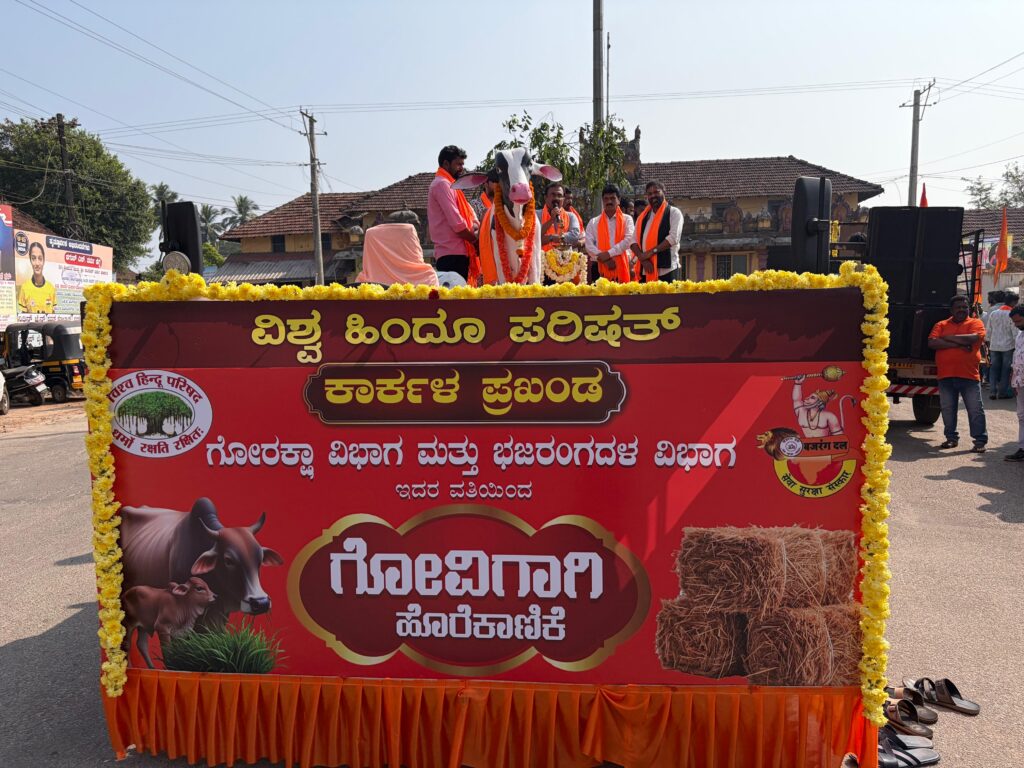 ವಿಶ್ವ ಹಿಂದೂ ಪರಿಷದ್ ಕಾರ್ಕಳ ಪ್ರಖಂಡ ಗೋರಕ್ಷಾ ವಿಭಾಗ ಮತ್ತು ಬಜರಂಗದಳ ವಿಭಾಗದ ನೇತೃತ್ವದಲ್ಲಿ ಗೋಮಾತೆಯ ಹಸಿವು ನೀಗಿಸಲು ವಿವಿಧ ಗೋಶಾಲೆಗಳಿಗೆ ಗೋಗ್ರಾಸ ನೀಡುವ ವಿಶಿಷ್ಟ ಕಾರ್ಯಕ್ರಮ ಗೋವಿಗಾಗಿ ಹೊರೆಕಾಣಿಕೆ ಮೆರವಣಿಗೆ 07-12-2025 ಆದಿತ್ಯವಾರ ಬೆಳಿಗ್ಗೆ ಗಂಟೆ 9:00ಕ್ಕೆ ವಿವಿಧ ಸ್ಥಳಗಳಿಂದ ಬಂದ ಹೊರೆಕಾಣಿಕೆ ಕಾರ್ಕಳ ಆನಂತಶಯನ ದೇವಸ್ಥಾನದಿಂದ ಉದ್ಘಾಟನೆಗೊಂಡು ಗೋಕಾಣಿಕಾ ಮೆರವಣಿಗೆ ಬಂಡೀಮಠ ಬಸ್ ಸ್ಟ್ಯಾಂಡ್‌ ವರೆಗೆ ಸಾಗಿ ವಿವಿಧ ಗೋಶಾಲೆಗಳಿಗೆ ನೀಡಲಾಯಿತು.