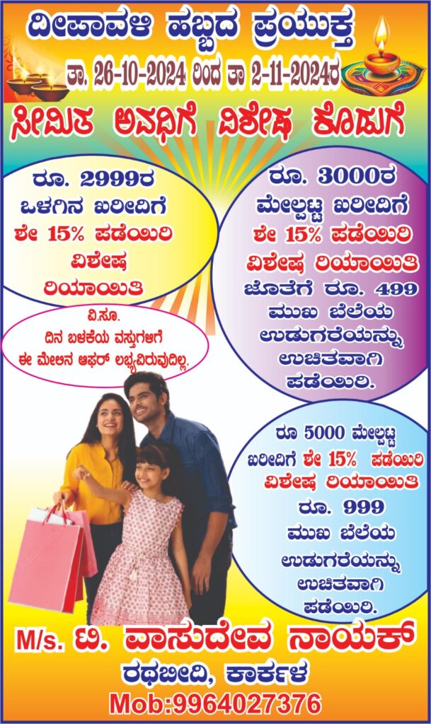 ದೀಪಾವಳಿ ಹಬ್ಬಕ್ಕೆ ಹೊಸ ಬಟ್ಟೆ ತೊಡುವುದೇ ಒಂದು ಸಂಭ್ರಮ. ಈ ಸಂಭ್ರಮವನ್ನು ಮತ್ತಷ್ಟು ಸಡಗರದೊಂದಿಗೆ ಆಚರಿಸಲು M/s ಟಿ.ವಾಸುದೇವ ನಾಯಕ್ ಜವಳಿ ಮಳಿಗೆಯು ವಿಶೇಷ ರಿಯಾಯಿತಿ ಹಾಗೂ ಕೊಡುಗೆಗಳನ್ನು ನೀಡುತ್ತಿದೆ.