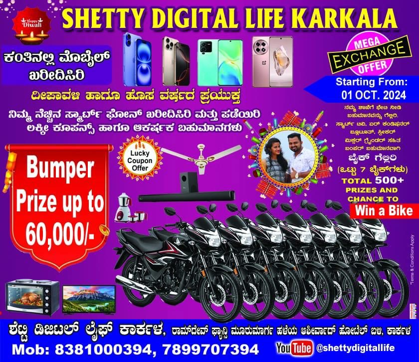 ಶೆಟ್ಟಿ ಡಿಜಿಟಲ್ ಲೈಫ್ ಕಾರ್ಕಳದಲ್ಲಿ, ದೀಪಾವಳಿ ಹಾಗೂ ಹೊಸ ವರ್ಷದ ಪ್ರಯುಕ್ತ ಸ್ಮಾರ್ಟ್ ಫೋನ್ ಖರೀದಿಸಿ ಲಕ್ಕಿ ಕೂಪನ್ಸ್ ಹಾಗೂ ಆಕರ್ಷಕ ಬಹುಮಾನಗಳನ್ನು ಪಡೆಯುವ ಅವಕಾಶ ನೀಡಲಾಗಿದೆ.