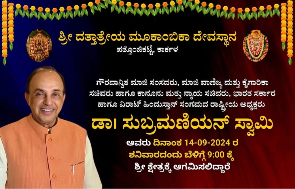 ಸೆಪ್ಟೆಂಬರ್ 14 ಕ್ಕೆ ಡಾ. ಸುಬ್ರಮಣಿಯನ್ ಸ್ವಾಮಿಯವರು ಕಾರ್ಕಳದ ಪತ್ತೊಂಜಿಕಟ್ಟೆಯ ಶ್ರೀ ದತ್ತಾತ್ರೇಯ ಮೂಕಾಂಬಿಕಾ ದೇವಸ್ಥಾನಕ್ಕೆ ಆಗಮಿಸಲಿದ್ದಾರೆ.