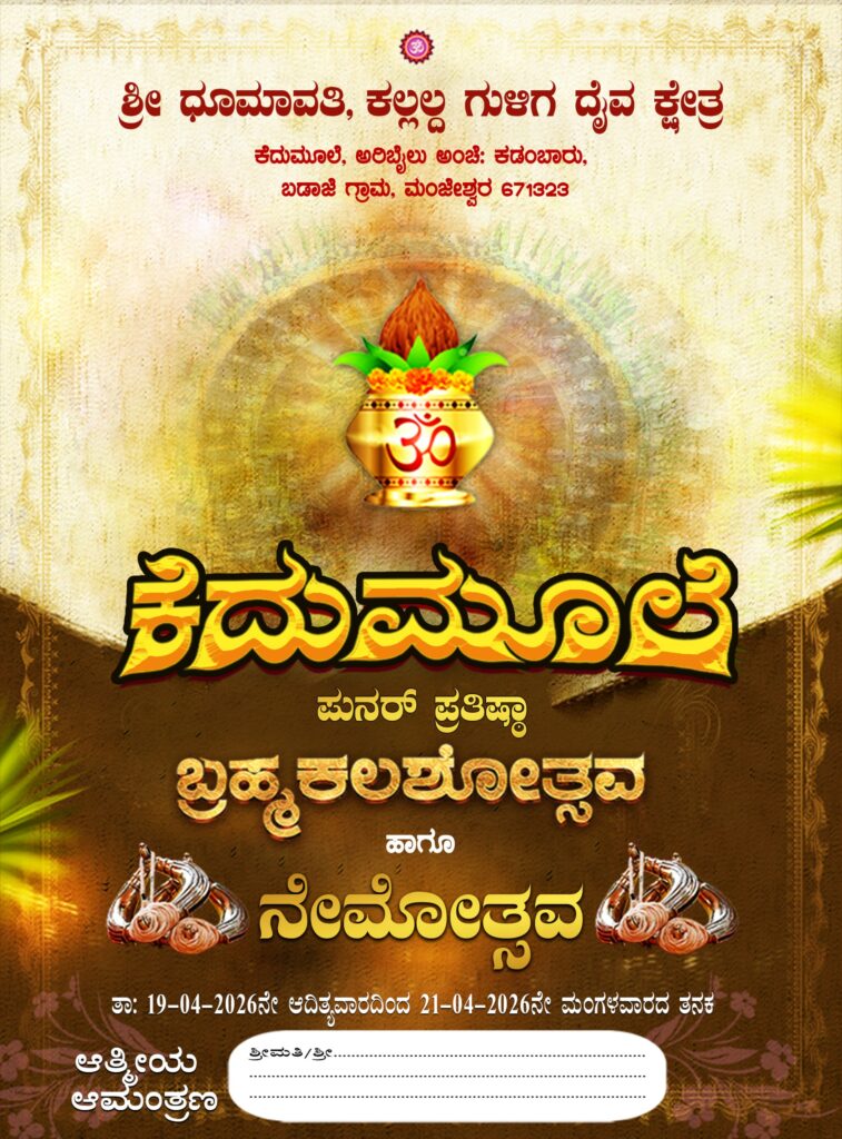 ಕಾಸರಗೋಡು ಜಿಲ್ಲೆ ಮಂಜೇಶ್ವರ ತಾಲೂಕಿನ ಬಡಾಜೆ ಗ್ರಾಮದ ಅರಿಬೈಲು ಕೆದುಮೂಲೆ ಶ್ರೀ ಧೂಮಾವತಿ ಮತ್ತು ಕಲ್ಲಲ್ದ ಗುಳಿಗ ದೈವದ ಕ್ಷೇತ್ರದಲ್ಲಿ ಪುನರ್ ಪ್ರತಿಷ್ಠಾ ಬ್ರಹ್ಮಕಲಶೋತ್ಸವ ಮತ್ತು ಶ್ರೀ ದೈವಗಳ ನೇಮೋತ್ಸವ ಇದೇ ಬರುವ ತಾರೀಕು 19.4.2026ಆದಿತ್ಯವಾರದಿಂದ 21.4.2026 ಮಂಗಳವಾರದ ವರೆಗೆ ವೈದಿಕ ಧಾರ್ಮಿಕ ಮತ್ತು ಸಾಂಸ್ಕೃತಿಕ ಕಾರ್ಯಕ್ರಮಗಳೊಂದಿಗೆ ವಿಜೃಂಭಣೆಯಿಂದ ಜರಗಲಿದೆ.