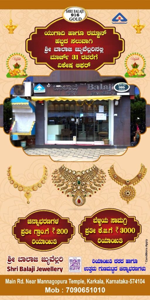 ಶ್ರೀ ಬಾಲಾಜಿ ಜ್ಯುವೆಲ್ಲೆರ್ಸ್ ನಲ್ಲಿ ಯುಗಾದಿ ಹಾಗೂ ರಂಜಾನ್ ಹಬ್ಬದ ಪ್ರಯುಕ್ತ ಮಾರ್ಚ್ 31ರವರೆಗೆ ವಿಶೇಷ ಆಫರ್ ನಡೆಯಲಿದೆ.