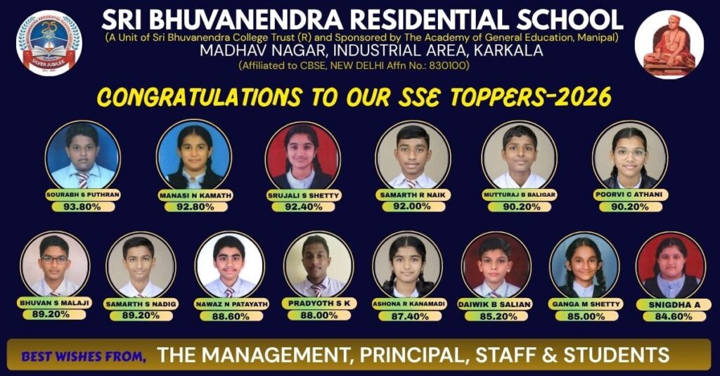 ಕಾರ್ಕಳ, ಎ.17: ಶ್ರೀ ಭುವನೇಂದ್ರ ರೆಸಿಡೆನ್ಸಿಯಲ್ ಸ್ಕೂಲ್ ಸಿ.ಬಿ.ಎಸ್.ಇ. 10ನೇ ತರಗತಿ ಪರೀಕ್ಷೆಯಲ್ಲಿ ಮಕ್ಕಳು ಉತ್ತಮ ಫಲಿತಾಂಶ ದಾಖಲಿಸಿದ್ದಾರೆ. 2025-26ನೇ ಶೈಕ್ಷಣಿಕ ವರ್ಷದ ಸಾಲಿನ ಪರೀಕ್ಷೆಗೆ ಹಾಜರಾದ 84 ವಿದ್ಯಾರ್ಥಿಗಳ ಪೈಕಿ 14 ವಿದ್ಯಾರ್ಥಿಗಳು ವಿಶಿಷ್ಟ ಶ್ರೇಣಿಯಲ್ಲಿ ತೇರ್ಗಡೆ ಹೊಂದಿದ್ದಾರೆ.