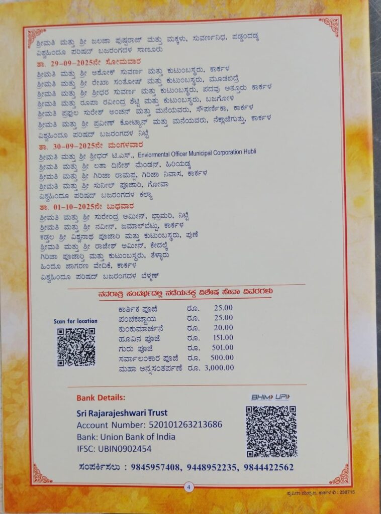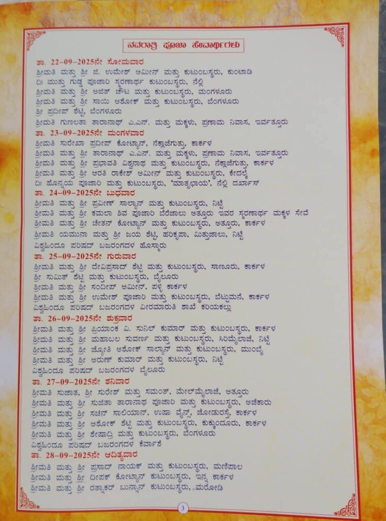 ಪ್ರತೀದಿನ ಸಂಜೆ 7.00 ರಿಂದ ಭಜನೆ,ಶ್ರೀದೇವಿಗೆ ಮಹಾಪೂಜೆ, ತದನಂತರ ಅನ್ನಸಂತರ್ಪಣೆ ಇರುವುದು. ಹಾಗೂ ದಿನಾಂಕ 1-10-2025 ರಂದು ಚಂಡಿಕಾಯಾಗ, ಮಹಾಪೂಜೆ ಮತ್ತು ಮಧ್ಯಾಹ್ನ ಮಹಾ ಅನ್ನಸಂತರ್ಪಣೆ ನಡೆಯಲಿದೆ ಎಂದು ಸುನೀಲ್ ಕೆ ಆರ್ ಆಡಳಿತ ಮೊಕ್ತೆಸರರು ಪ್ರಕಟಣೆಯಲ್ಲಿ ತಿಳಿಸಿದ್ದಾರೆ.