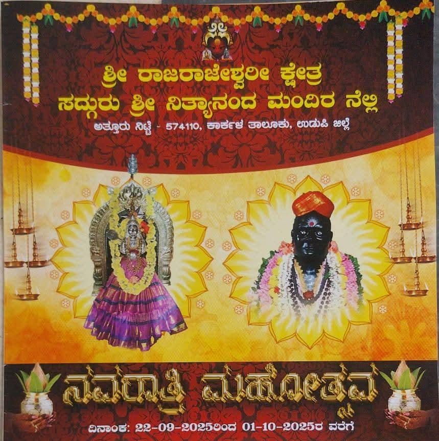 ನಿಟ್ಟೆ : ಶ್ರೀ ರಾಜರಾಜೇಶ್ವರಿ ಕ್ಷೇತ್ರ ಸದ್ಗುರು ಶ್ರೀ ನಿತ್ಯಾನಂದ ಮಂದಿರ ನೆಲ್ಲಿ ಅತ್ತೂರು ನಿಟ್ಟೆ ಶ್ರೀ ಕ್ಷೇತ್ರದ ವೈಭವದ ಬ್ರಹ್ಮಕಲಶೋತ್ಸವ ಜರುಗಿದ ನಂತರ ಪ್ರಥಮ ನವರಾತ್ರಿಯು ಉತ್ಸವವು ದಿನಾಂಕ 22-09-2025 ರಿಂದ 1-10-2025 ವರೆಗೆ ನಡೆಯಲಿದೆ.