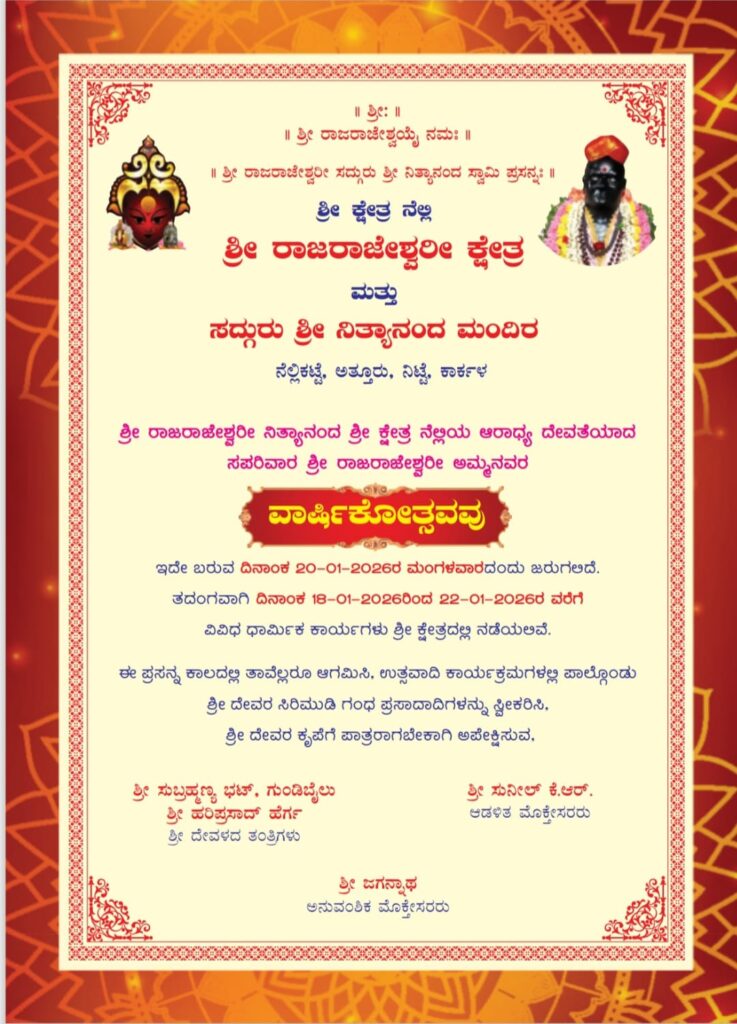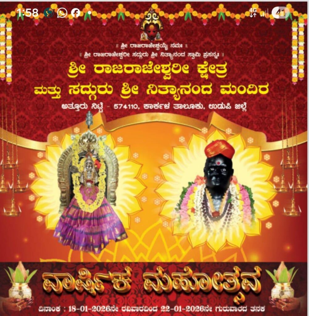 HomeBlogಶ್ರೀ ರಾಜರಾಜೇಶ್ವರಿ ಕ್ಷೇತ್ರ ಮತ್ತು ಸದ್ಗುರು ಶ್ರೀ ನಿತ್ಯಾನಂದ ಮಂದಿರ ಅತ್ತೂರು ನಿಟ್ಟೆ ವಾರ್ಷಿಕ... Blog ಶ್ರೀ ರಾಜರಾಜೇಶ್ವರಿ ಕ್ಷೇತ್ರ ಮತ್ತು ಸದ್ಗುರು ಶ್ರೀ ನಿತ್ಯಾನಂದ ಮಂದಿರ ಅತ್ತೂರು ನಿಟ್ಟೆ ವಾರ್ಷಿಕ ಮಹೋತ್ಸವ By nammakarla.in January 17, 2026 0 Share FacebookTwitterWhatsAppCopy URL ಶ್ರೀ ರಾಜರಾಜೇಶ್ವರಿ ಕ್ಷೇತ್ರ ಮತ್ತು ಸದ್ಗುರು ಶ್ರೀ ನಿತ್ಯಾನಂದ ಮಂದಿರ ಅತ್ತೂರು ನಿಟ್ಟೆ ವಾರ್ಷಿಕ ಮಹೋತ್ಸವವು ದಿನಾಂಕ 18-01-20026 ನೇ ರವಿವಾರದಿಂದ 22-01-2026 ಗುರುವಾರ ತನಕ ನಡೆಯಲಿದೆ Share FacebookTwitterWhatsAppCopy URL Previous articleರಕ್ಷಾ ರೆಂಜಾಳ ಇವರಿಗೆ ಶಿಕ್ಷಣ,ಕ್ರೀಡೆ ಮತ್ತು ಸಂಸ್ಕೃತಿ ಸಾಧನಾ ಪ್ರಶಸ್ತಿNext articleಜ.19ರಿಂದ ಆರಂಭವಾಗಲಿರುವ ದ್ವಿತೀಯ ಪಿಯುಸಿ ಪೂರ್ವ ಸಿದ್ಧತಾ ಪರೀಕ್ಷೆ 2ರಲ್ಲಿ ಮತ್ತೆ ಪ್ರಶ್ನೆಪತ್ರಿಕೆ ಲೀಕ್ ಆದರೆ ಪ್ರಿನ್ಸಿಪಾಲ್ ವಿರುದ್ಧ ಕೇಸ್ nammakarla.inhttp://nammakarla.in RELATED ARTICLES Blog ರಾಜ್ಯ ಪ್ರಶಸ್ತಿ ಪುರಸ್ಕೃತ ಯುವಕ ಮಂಡಲ (ರಿ.) ಸಾಣೂರು ಇದರ 2026/28 ನೇ ಸಾಲಿನ ಪದಾಧಿಕಾರಿಗಳ ಆಯ್ಕೆ ಉಪಾಧ್ಯಕ್ಷರಾಗಿ ಮೋಹನ್ ಶೆಟ್ಟಿ ಸಾಣೂರು ಕಾರ್ಯದರ್ಶಿಯಾಗಿ ರಾಜೇಶ್ ಪೂಜಾರಿ ಅವಿರೋಧವಾಗಿ ಆಯ್ಕೆ January 25, 2026 Blog ವಿದ್ಯಾರ್ಥಿಗಳೇ…. ಆಲ್ ದಿ ಬೆಸ್ಟ್ January 25, 2026 Blog ಕ್ರೈಸ್ ಕಿಂಗ್ : ಅದ್ದೂರಿಯಾಗಿ ಜರುಗಿದ ಪ್ರಾಥಮಿಕ ಶಾಲಾ ವಾರ್ಷಿಕೋತ್ಸವ January 25, 2026 LEAVE A REPLY Cancel reply Comment: Please enter your comment! Name:* Please enter your name here Email:* You have entered an incorrect email address! Please enter your email address here Website: Save my name, email, and website in this browser for the next time I comment. - Advertisment - Most Popular ರಾಜ್ಯ ಪ್ರಶಸ್ತಿ ಪುರಸ್ಕೃತ ಯುವಕ ಮಂಡಲ (ರಿ.) ಸಾಣೂರು ಇದರ 2026/28 ನೇ ಸಾಲಿನ ಪದಾಧಿಕಾರಿಗಳ ಆಯ್ಕೆ ಉಪಾಧ್ಯಕ್ಷರಾಗಿ ಮೋಹನ್ ಶೆಟ್ಟಿ ಸಾಣೂರು ಕಾರ್ಯದರ್ಶಿಯಾಗಿ ರಾಜೇಶ್ ಪೂಜಾರಿ ಅವಿರೋಧವಾಗಿ ಆಯ್ಕೆ January 25, 2026 ವಿದ್ಯಾರ್ಥಿಗಳೇ…. ಆಲ್ ದಿ ಬೆಸ್ಟ್ January 25, 2026 ಕ್ರೈಸ್ ಕಿಂಗ್ : ಅದ್ದೂರಿಯಾಗಿ ಜರುಗಿದ ಪ್ರಾಥಮಿಕ ಶಾಲಾ ವಾರ್ಷಿಕೋತ್ಸವ January 25, 2026 ಚಿನ್ನದ ಪದಕದೊಂದಿಗೆ ರಾಷ್ಟ್ರಮಟ್ಟಕ್ಕೆ ಆಯ್ಕೆ, January 25, 2026 Load more Recent Comments