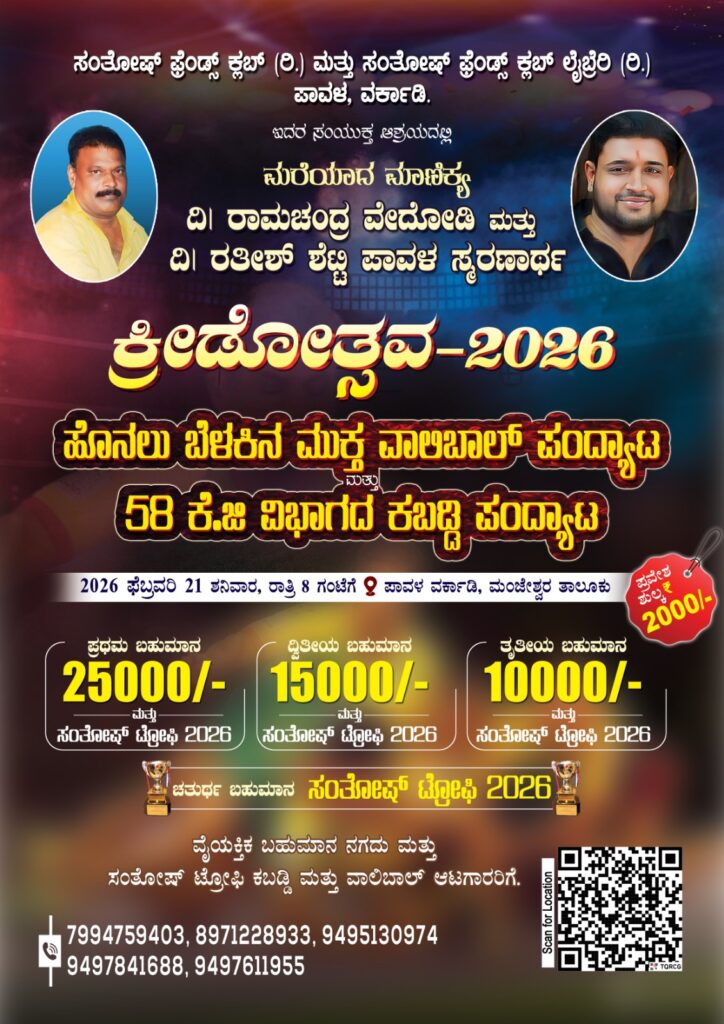 ಸಂತೋಷ್ ಫ್ರೆಂಡ್ಸ್ ಕ್ಲಬ್ ರಿ. ಮತ್ತು ಸಂತೋಷ ಫ್ರೆಂಡ್ಸ್ ಕ್ಲಬ್ ಲೈಬ್ರರಿ ರಿ. ಪಾವಳ,ವರ್ಕಾಡಿ, ಕ್ರೀಡೋತ್ಸವ- 2026
