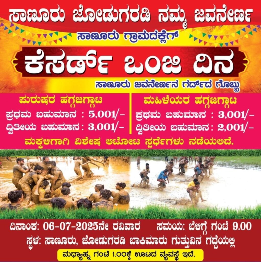 ನಾಳೆ ಜು. 06 ರವಿವಾರದಂದು ಸಾಣೂರಿನ ಜೋಡುಗರಡಿ ಬಾಕಿಮಾರು ಗುತ್ತಿನ ಗದ್ದೆಯಲ್ಲಿ “ಕೆಸರ್ಡ್ ಒಂಜಿ ದಿನ” ಎಂಬ ಮನೋರಂಜನಾ ಕಾರ್ಯಕ್ರಮ ನಡೆಯಲಿದೆ.