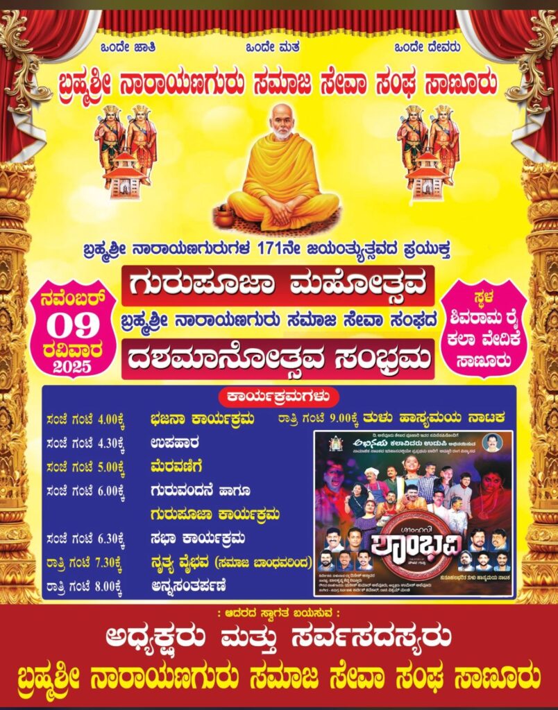 ನ. 9 ರವಿವಾರದಂದು ಬ್ರಹ್ಮಶ್ರೀ ನಾರಾಯಣ ಗುರುಗಳ 171ನೇ ಜಯಂತ್ಯುತ್ಸವದ ಪ್ರಯುಕ್ತ ಬ್ರಹ್ಮಶ್ರೀ ನಾರಾಯಣ ಗುರು ಸಮಾಜಸೇವಾ ಸಂಘ ಸಾಣೂರಿನಲ್ಲಿ ಗುರುಪೂಜಾ ಮಹೋತ್ಸವ ಹಾಗೂ ಸಂಘದ ದಶಮಾನೋತ್ಸವ ಸಂಭ್ರಮ ನಡೆಯಲಿದೆ.