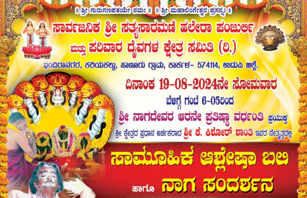 ದಿನಾಂಕ 18-08-2024 ಸಾರ್ವಜನಿಕ ಸತ್ಯ ಸಾರಮಣಿ ಹಲೇರಾ ಪಂಜುರ್ಲಿ ಮತ್ತು ಪರಿವಾರ ದೈವಗಳ ಕ್ಷೇತ್ರ ಸಮಿತಿ (ರಿ )ಸಂಜೆ 6.30 ಕುಣಿತ ಭಜನೆಯ ಉದ್ಘಾಟನೆಯು ಗಣ್ಯರಿಂದ ನಡೆಯಲಿದ್ದು ನಂತರ ಸದಸ್ಯರಿಂದ ಕುಣಿತ ಭಜನೆಯು ನಡೆಯಲಿದೆ.ಸೋಮವಾರ ದಿನಾಂಕ 19-08-2024 ಸೋಮವಾರದಂದು ಬೆಳಿಗ್ಗೆ 6.05 ರಿಂದ ಶ್ರೀ ನಾಗದೇವರ ಆರನೇ ಪ್ರತಿಷ್ಠಾ ವರ್ದಂತಿ ಪ್ರಯುಕ್ತ ಶ್ರೀ ಕ್ಷೇತ್ರದ ಪ್ರಧಾನ ಅರ್ಚಕರಾದ ಕೆ. ಕಿಶೋರ್ ಶಾಂತಿ ಇವರ ನೇತೃತ್ವದಲ್ಲಿ ಸಾಮೂಹಿಕ ಆಶ್ಲೇಷ ಬಲಿ ಹಾಗೂ ನಾಗ ಸಂದರ್ಶನ ನಾಗಪಾತ್ರಿ ದಯಾನಂದ ಧರ್ಮದರ್ಶಿ, ಶ್ರೀ ಆದಿಮಾಯೆ ದೇವಸ್ಥಾನ ಜೆಪ್ಪಿನ ಮೊಗರು ಮಂಗಳೂರು ಇವರಿಂದ ನಡೆಯಲಿದೆ ಎಂದು ಪ್ರಕಟಣೆಯಲ್ಲಿ ತಿಳಿಸಿದ್ದಾರೆ