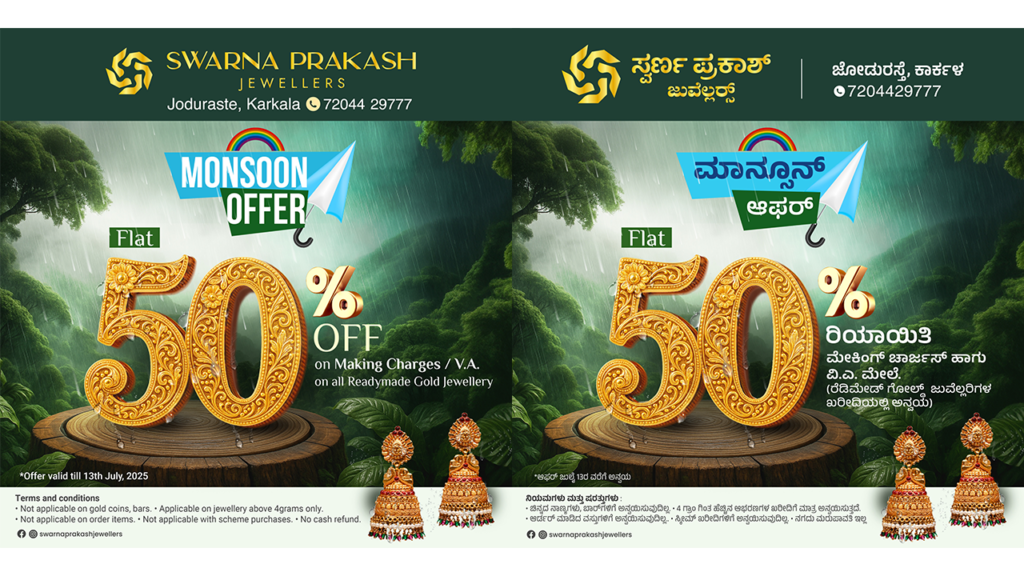 ಕಾರ್ಕಳ: ಕಾರ್ಕಳದ ಜೋಡು ರಸ್ತೆ ಬಳಿ ಇರುವ ಸ್ವರ್ಣ ಪ್ರಕಾಶ್ ಜ್ಯುವೆಲ್ಲರ್ಸ್ ನಲ್ಲಿ ಮಾನ್ಸೂನ್ ಆಫರ್ ಆರಂಭವಾಗಿದ್ದು ಹೀಗಾಗಿ ಜುಲೈ 13ರವರೆಗೆ ರೆಡಿಮೇಡ್ ಗೋಲ್ಡ್ ಜ್ಯುವೆಲ್ಲರಿಗಳ ಖರೀದಿಯಲ್ಲಿ ಮೇಕಿಂಗ್ ಚಾರ್ಜಸ್ ಹಾಗೂ ವಿ.ಎ