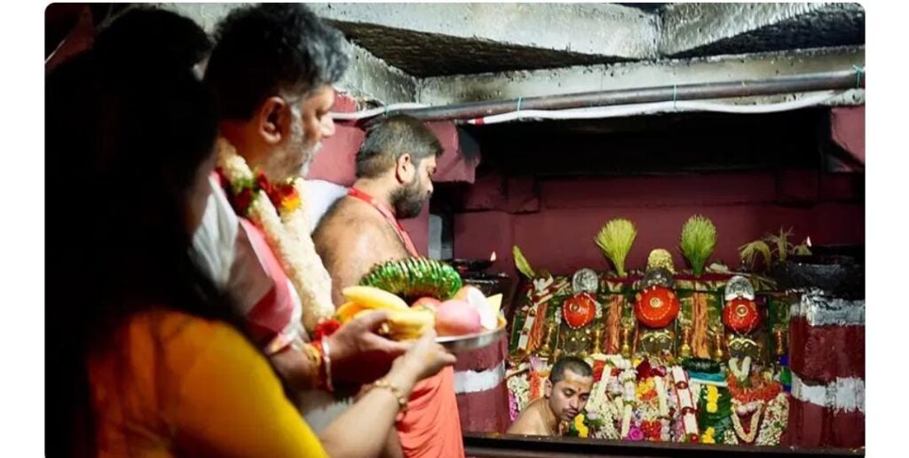ರಾಜ್ಯದಲ್ಲಿ ಸಚಿವ ಸಂಪುಟ ಪುನಾರಚನೆಗೆ ಕಸರತ್ತು ನಡೆಯುತ್ತಿರುವ ಹೊತ್ತಿನಲ್ಲೇ ಡಿಸಿಎಂಗೆ ವಿಜಯೀ ಶ್ರೇಯಸ್ಸು ಲಭಿಸಲೆಂದು ನಾರಾಯಣಿ ನಮಸ್ಕಾರ ಮಂತ್ರದ ಮೂಲಕ ಪೂಜೆ ಸಲ್ಲಿಸಲಾಯಿತು. ಸುಮಾರು ಐದು ನಿಮಿಷ ದುರ್ಗಾ ಸಪ್ತಸತಿಯ 11ನೇ ಅಧ್ಯಾಯದ ನಾರಾಯಣಿ ನಮಸ್ಕಾರ ಮಂತ್ರ ಹೇಳಿ ಅರ್ಚಕರು ಪೂಜೆ ನೆರವೇರಿಸಿದ್ದು ಡಿಕೆಶಿ ಕೂಡ ʻಶತ್ರುವಿನ ಮೇಲೆ ವಿಜಯ ಸಾಧಿಸಲು ಖಡ್ಗಮಾಲ ಸ್ತೋತ್ರʼ ಪಠಿಸಿದರು. ಇದೇ ಶುಭ ಸಮಯದಲ್ಲಿ ದೇವಿಯ ಬಲಗಡೆಯಿಂದ 2 ಬಾರಿ ಹೂವು ವರವಾಗಿ ಬಿದ್ದಿತು.