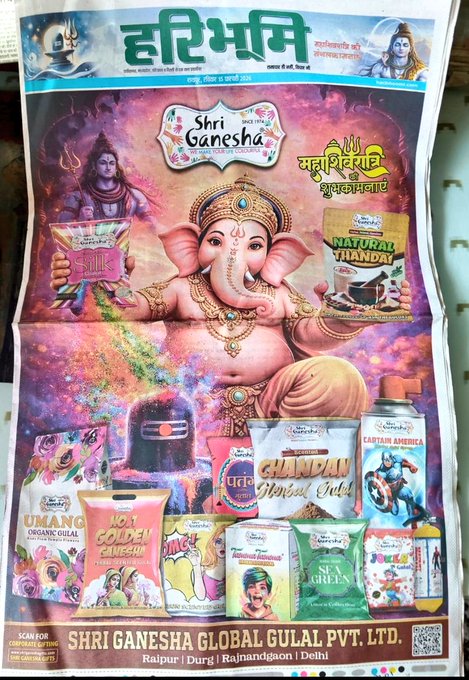 ರಾಯಪುರ (ಛತ್ತೀಸ್‌ಗಢ): ಮಹಾಶಿವರಾತ್ರಿಯ ಪವಿತ್ರ ಸಂದರ್ಭದಲ್ಲಿ ಛತ್ತೀಸ್‌ಗಢದ ಪ್ರಮುಖ ದಿನಪತ್ರಿಕೆಗಳಾದ ‘ದೈನಿಕ ಭಾಸ್ಕರ್’ ಮತ್ತು ‘ಹರಿಭೂಮಿ’ಯಲ್ಲಿ ಭಗವಾನ್ ಶಿವ ಮತ್ತು ಶ್ರೀ ಗಣೇಶನನ್ನು ವಾಣಿಜ್ಯ ಜಾಹೀರಾತುಗಳಲ್ಲಿ ಅನುಚಿತವಾಗಿ ಬಳಸಿಕೊಂಡ ‘ಶ್ರೀ ಗಣೇಶ್ ಗ್ಲೋಬಲ್ ಗುಲಾಲ್ ಪ್ರೈವೇಟ್ ಲಿಮಿಟೆಡ್’ ಕಂಪನಿಯ ವಿರುದ್ಧ ಹಿಂದೂ ಜನಜಾಗೃತಿ ಸಮಿತಿಯು ನಡೆಸಿದ ತೀವ್ರ ಪ್ರತಿಭಟನೆಗೆ ದೊಡ್ಡ ಯಶಸ್ಸು ಸಿಕ್ಕಿದೆ. ಸಮಿತಿಯ ಮಹಾರಾಷ್ಟ್ರ ಮತ್ತು ಛತ್ತೀಸ್‌ಗಢ ರಾಜ್ಯ ಸಂಘಟಕರಾದ ಶ್ರೀ. ಸುನೀಲ್ ಘನವಟ್ ಅವರು ಈ ಅವಮಾನಕಾರಿ ಜಾಹೀರಾತಿನ ವಿರುದ್ಧ ಪೊಲೀಸ್ ಕ್ರಮಕ್ಕೆ ಒತ್ತಾಯಿಸಿದ ನಂತರ, ಕಂಪನಿಯು ಲಿಖಿತವಾಗಿ ಬೇಷರತ್ ಕ್ಷಮೆಯಾಚಿಸಿದೆ.