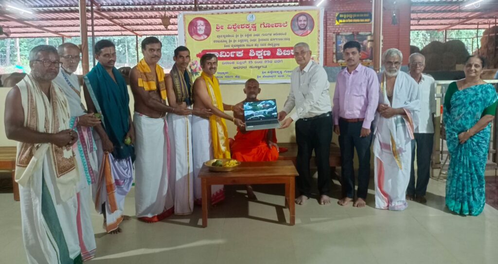 ಹೆಬ್ರಿ :ಹೆಬ್ರಿ ಧಾರ್ಮಿಕ ಶಿಕ್ಷಣ ಶಿಬಿರದ ವ್ಯವಸ್ಥಾಪನಾ ಸಮಿತಿಯ ವತಿಯಿಂದ ಗಿಲ್ಲಾಳಿ ಶ್ರೀ ವಿಶ್ವೇಶಕೃಷ್ಣ ಗೋಶಾಲೆಯ ಕಾರ್ಯಾಲಯದ ಕೆಲಸಗಳಿಗೆ ಅನುಕೂಲವಾಗುವಂತೆ ಲ್ಯಾಪ್ ಟ್ಯಾಪ್ ನ್ನು ಪೇಜಾವರ ಮಠಾಧೀಶರಾದ ಶ್ರೀ ಶ್ರೀ ವಿಶ್ವಪ್ರಸನ್ನ ತೀರ್ಥ ಸ್ವಾಮೀಜಿಯವರಿಗೆ ಸಮರ್ಪಿಸಿ ಗೋಶಾಲೆಯ ಟ್ರಸ್ಟಿಗಳಿಗೆ ಹಸ್ತಾಂತರಿಸಲಾಯಿತು. ಈ ಸಂದರ್ಭದಲ್ಲಿ ಗೋಶಾಲೆಯ ಟ್ರಸ್ಟಿಗಳಾದ ವಿದ್ವಾನ್ ಪದ್ಮನಾಭ ಆಚಾರ್ಯ, ಸಿಎ ಎಂ. ರವಿರಾವ್, ಡಾ. ಭಾರ್ಗವಿ ಆರ್. ಐತಾಳ್, ವಿದ್ವಾನ್ ವಿಷ್ಣುಮೂರ್ತಿ ಆಚಾರ್ಯ, ವಿಷ್ಣುಮೂರ್ತಿ ನಾಯಕ್ ಮತ್ತು ಶಿಬಿರ ವ್ಯವಸ್ಥಾಪನ ಸಮಿತಿಯ ವಿದ್ವಾನ್ ವೇದವ್ಯಾಸ ತಂತ್ರಿ ಮಡಾಮಕ್ಕಿ, ಬಲ್ಲಾಡಿ ಚಂದ್ರಶೇಖರ ಭಟ್, ವರಂಗ ರಾಮಚಂದ್ರ ಭಟ್, ಸುದರ್ಶನ್ ಕಲ್ಕೂರ್ ಉಪ್ಪಳ ಹಾಗೂ ಗೋಶಾಲೆಯ ಉಸ್ತುವಾರಿ ಸುಬ್ರಮಣ್ಯ ನಾಯಕ್, ಹೆಬ್ರಿ ಗಣಪತಿ ಪ್ರಭು ಉಪಸ್ಥಿತರಿದ್ದರು.