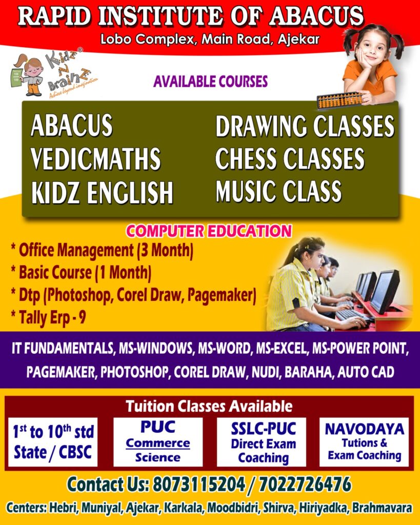 ಅಜೆಕಾರಿನ ಲೋಬೊ ಕಾಂಪ್ಲೆಕ್ಸ್ ನಲ್ಲಿ RAPID INSTITUTE OF ABACUS ನಲ್ಲಿ ದಾಖಲಾತಿ ಆರಂಭವಾಗಿದೆ.